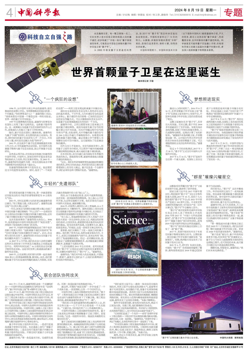 “我們的工作是把潘建偉的想法搬到天上去,把天空和大地——幾千萬(wàn)平方公里變成一個(gè)大實(shí)驗(yàn)室?!蓖踅ㄓ钫f(shuō),當(dāng)時(shí)他們列了六七件最難的事兒。